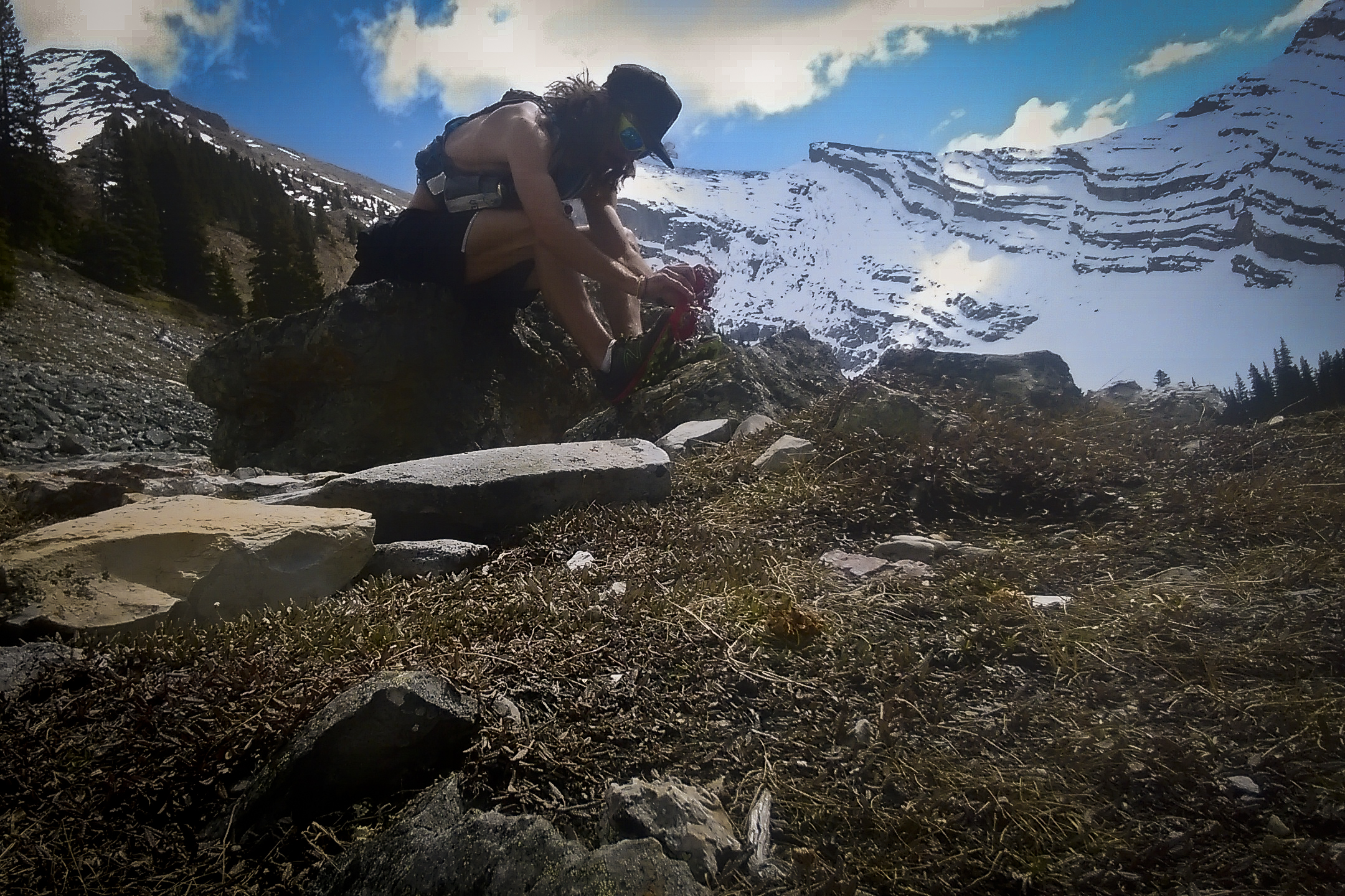 22/05/15 – Heart – 1h24m/6km/760m Up and down Heart Mountain fast to christen new running toys with blood, sweat and scree dust. I had to drive to Calgary to do passport stuff and stopped at The Tech Shop on 4th Ave on my way out of town. Running-specific shops are hard enough to come by, but ones carrying the kind of stuff that caters to finicky ultra/trail runners is an even less common find. I picked me up a pair of New Balance MT110s (the original version!) — a coveted trail sneaker I wore frequently in 2013 but have had difficulty finding since then — and a Salomon Sense 1L vest. These items will hopefully support me through summer 2015 and get me through the race in Chamonix next month.