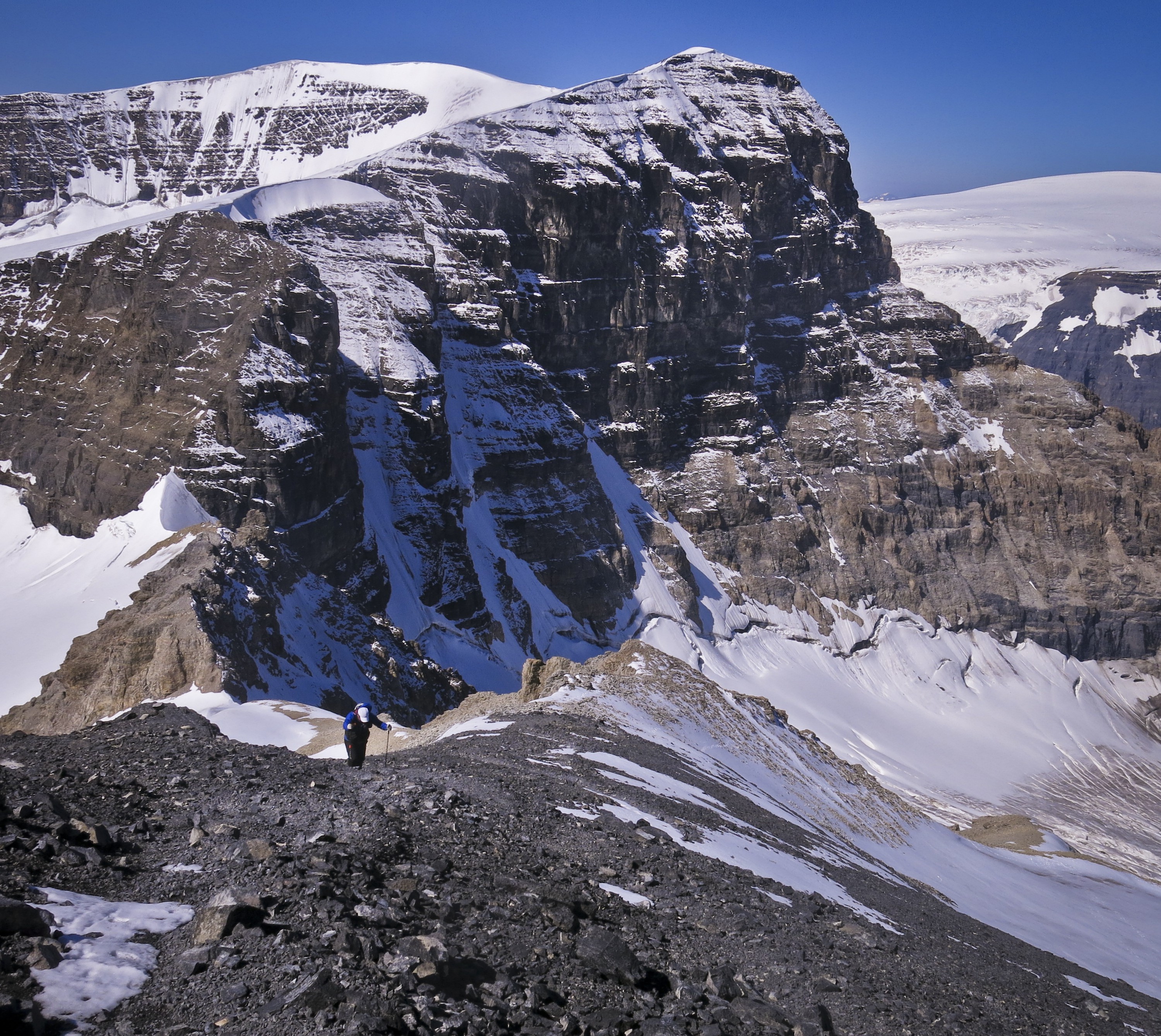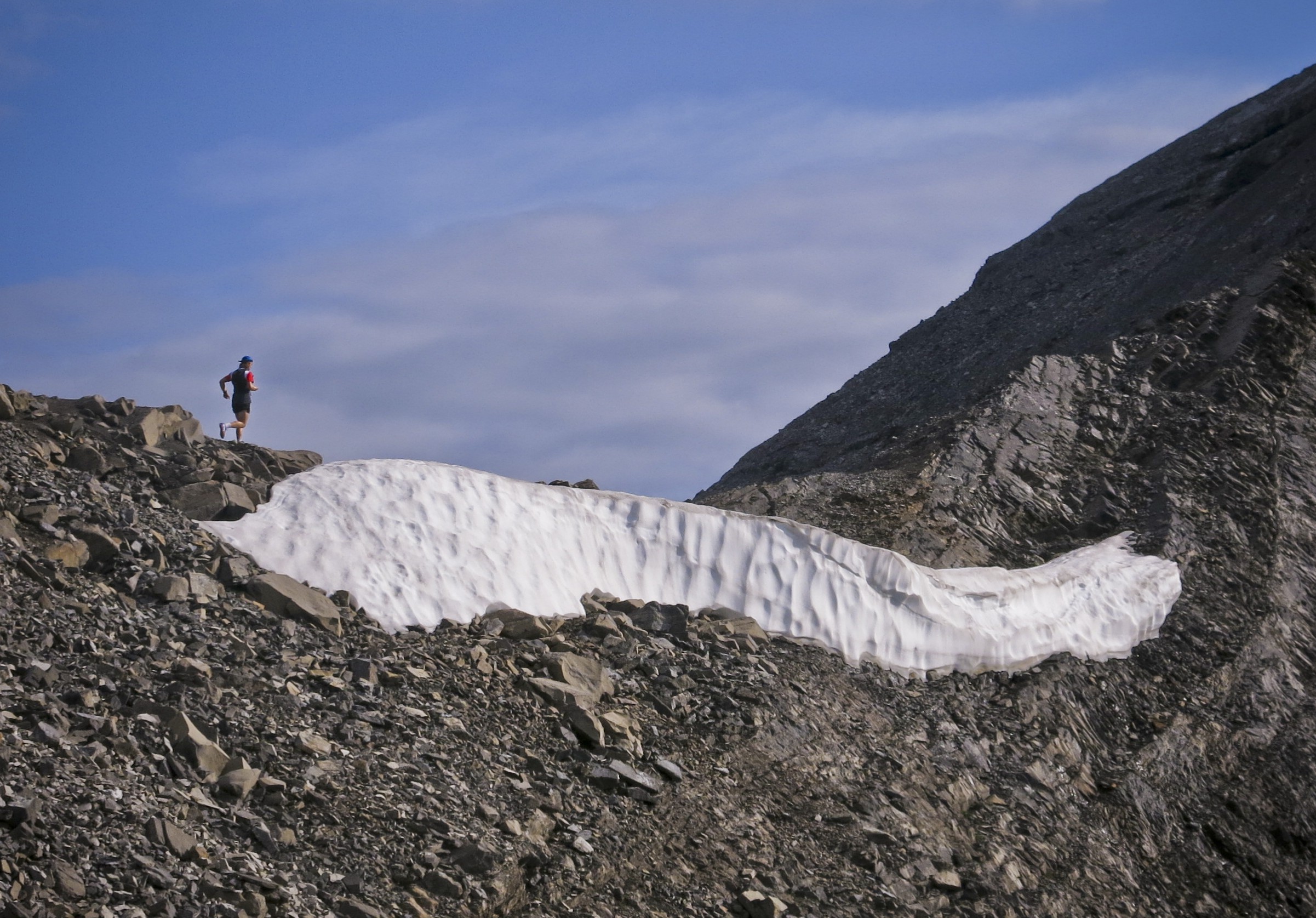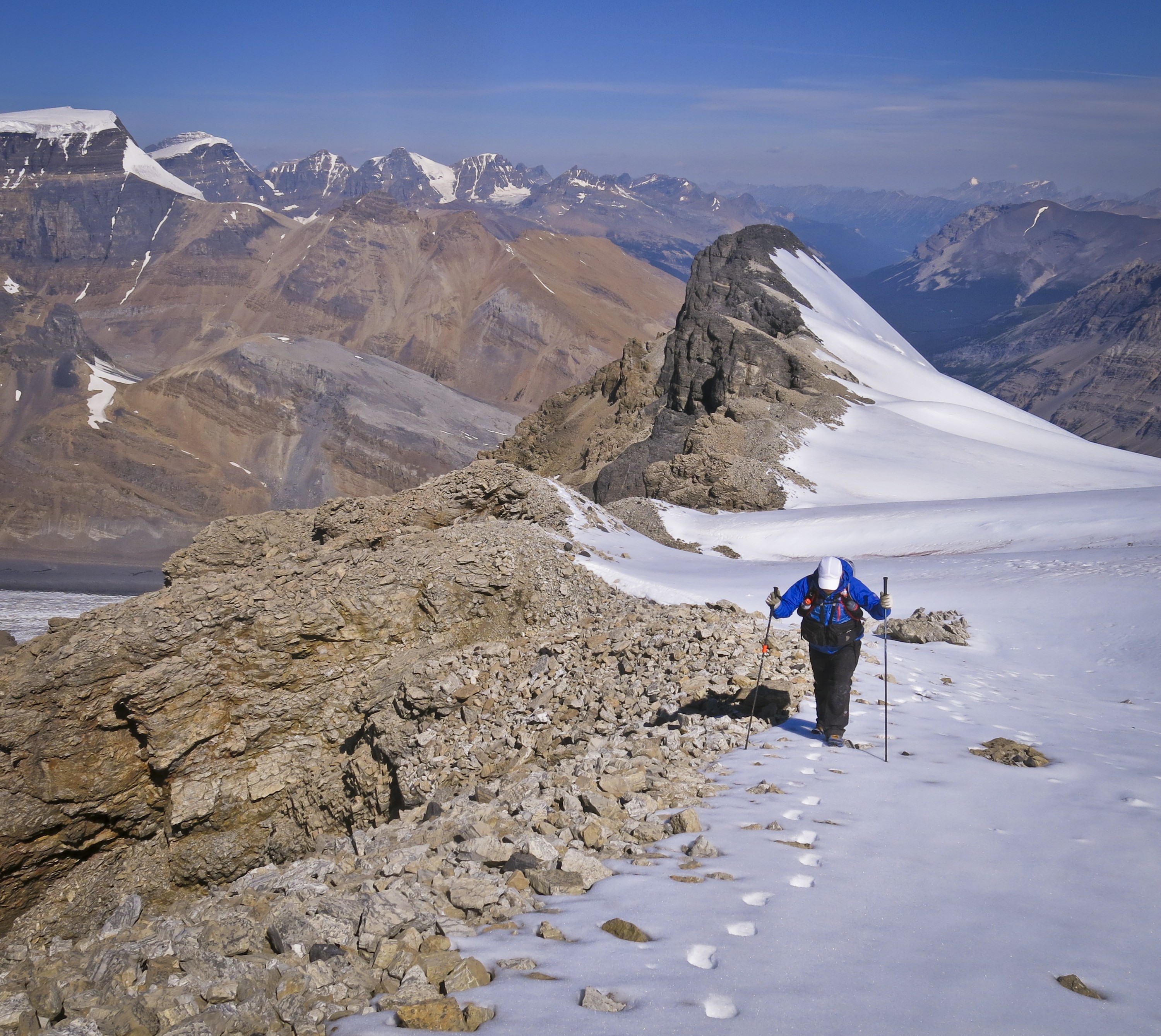 I spent the last two days of July skateboarding back and forth to bag a local peak, then slogging up a glaciated elevener far from home. On Thursday (30th), I finally summited Mount Cory after three previous attempts, continually shut down due to rain or time or something. On Friday (31st) Glenn and I climbed most of 3400m Mount Athabasca via the AA Col “scramble route” which we’d done previously in 2013. Athabasca is amazing — views from the top reveal a metropolis of geometric mountain forms smeared with flowing white glaciers — though the route is one of the least enjoyable I’ve encountered. Imagine sidehilling through an endless ball pit of scree and grovelling up gullies of hard ledges littered with choss on top of choss. Sounds like standard fare when it comes to scrambling in the Canadian Rockies but this was particularly bad. We gained the 3400m Silverhorn and dropped down to inspect the final snowy ridgewalk to the summit, which realistically called for ice axes and some sort of traction device, at least Microspikes, rather than the bald and shredded MT110s I happened to be wearing. Not a bad accomplishment for running shoes, however.
