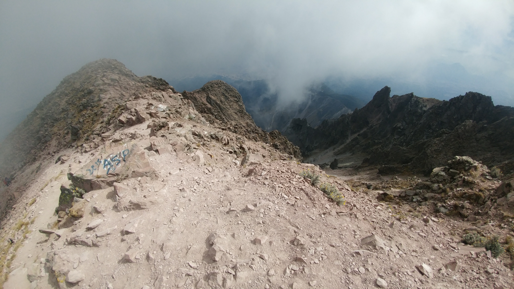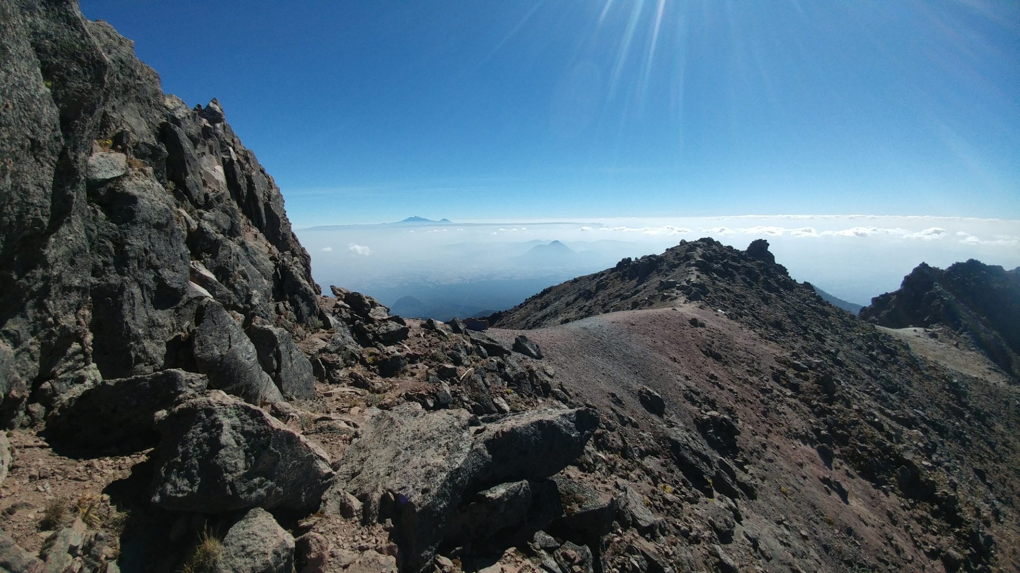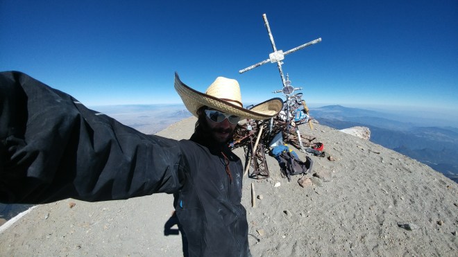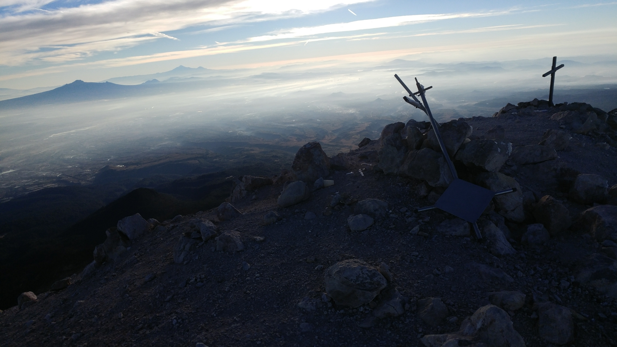 I got to the summit and no one was there. I’d expected to meet a mob of mountaineers who’d come up the north side but I was alone to take in the 360° view of Mexico. The weather was pleasant besides a cold wind that whistled through the mass of steel on the summit adorned with prayer flags, crucifixes, and other objects non-religious in nature. Behind, El Pico’s crumbling caldera yawned.