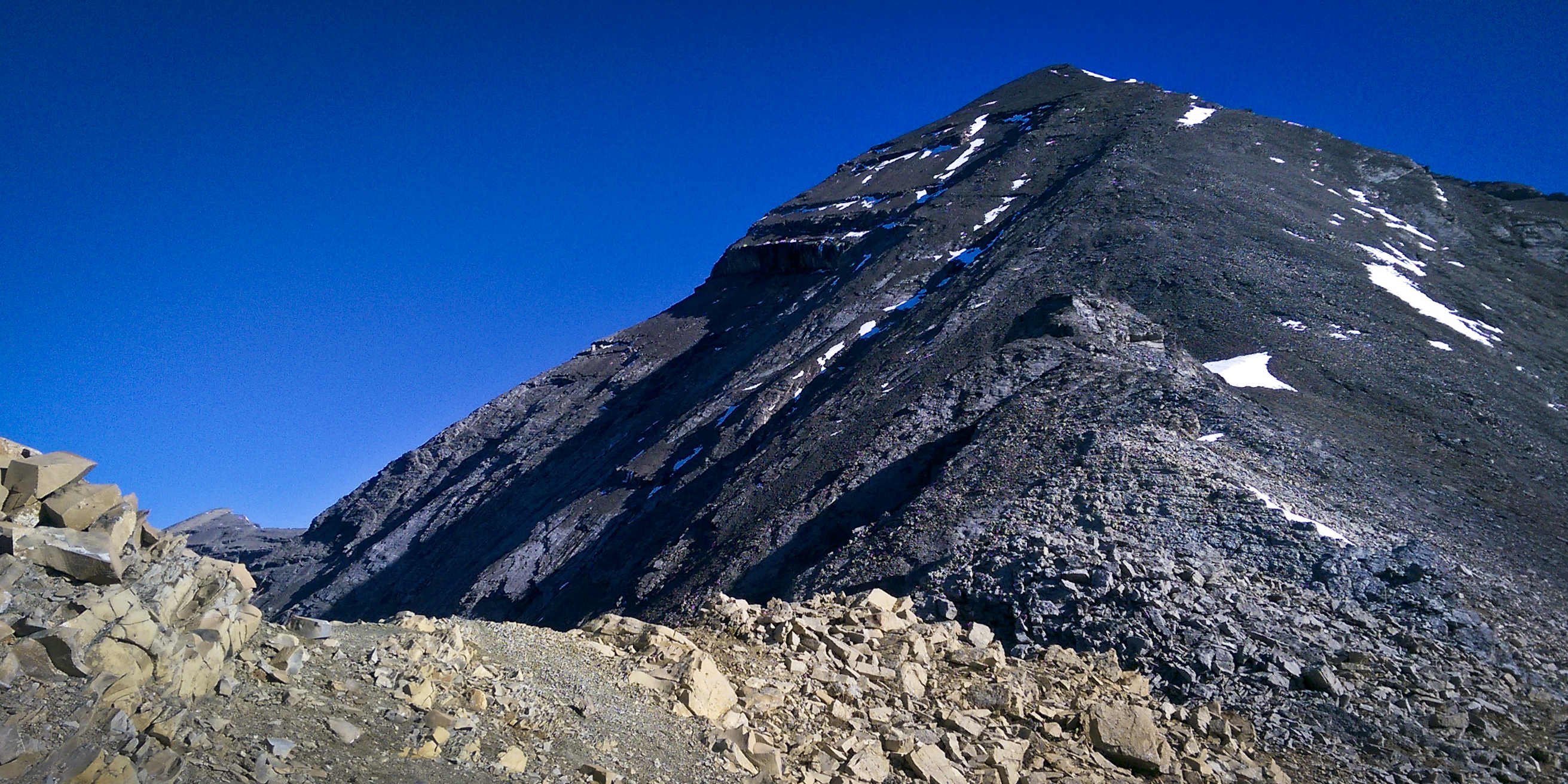 All of the various animal, boot and ski tracks petered out around my high point from the previous week and so it was trail-breaking time. I slogged for another four or five hundred vertical metres, step by painstaking step. The thought that I could turn around and ski down at any moment was as stifling and omnipresent as the sun but I continued to march — I wanted to touch that stupid observatory on top of Sanson’s Peak, just like in the summertime, but with skis on my back. I haven’t experienced that level of deathmarch in a long time.