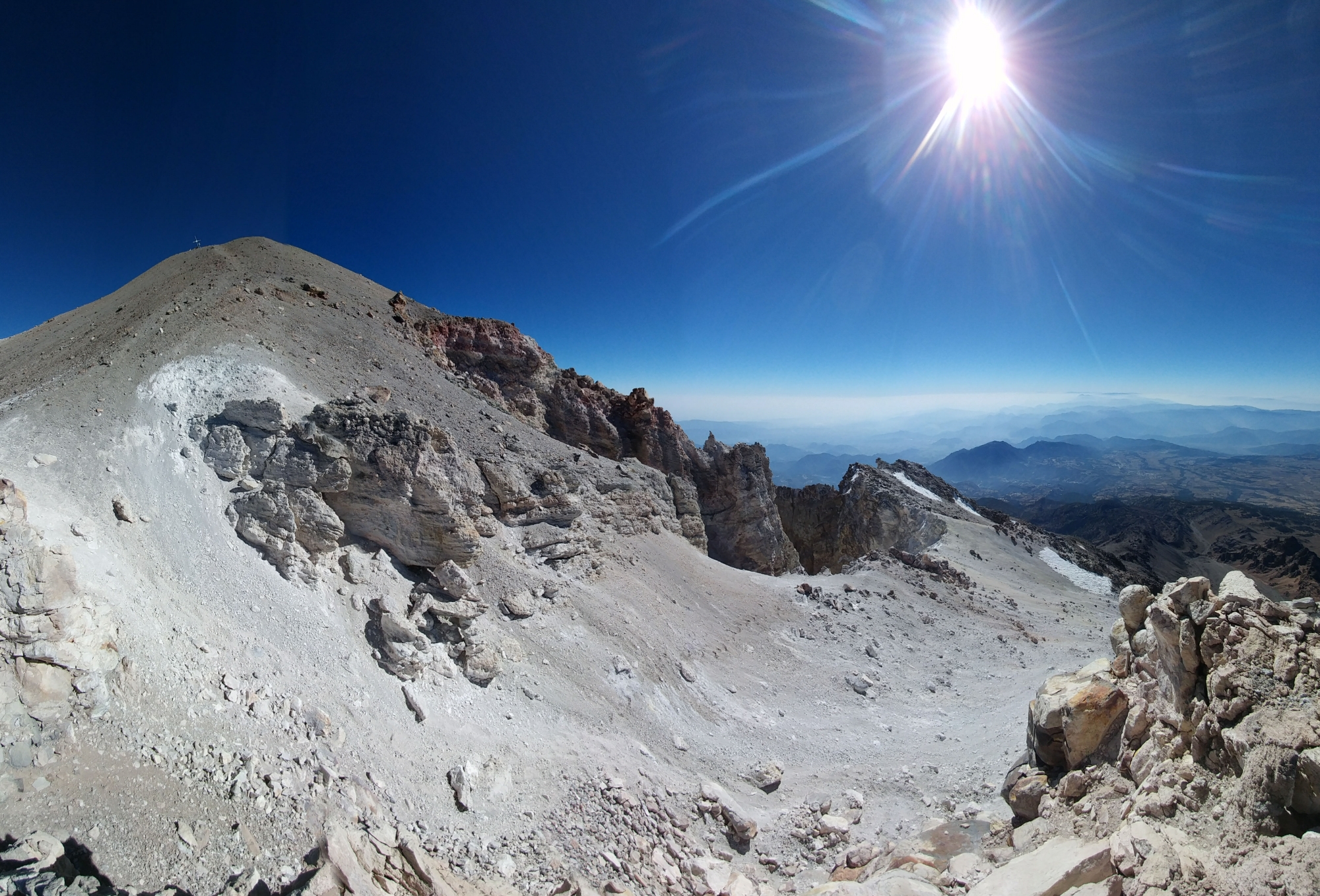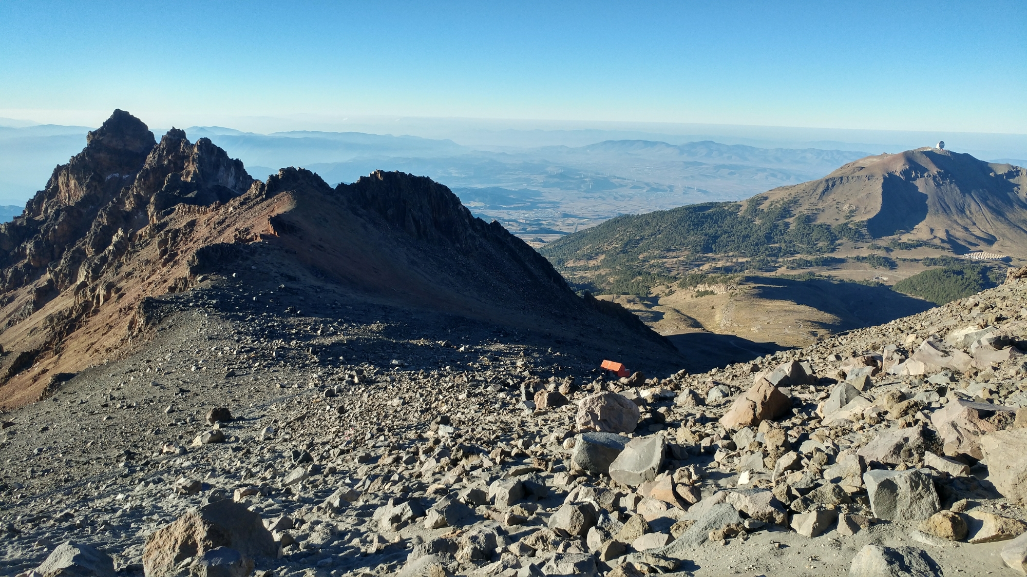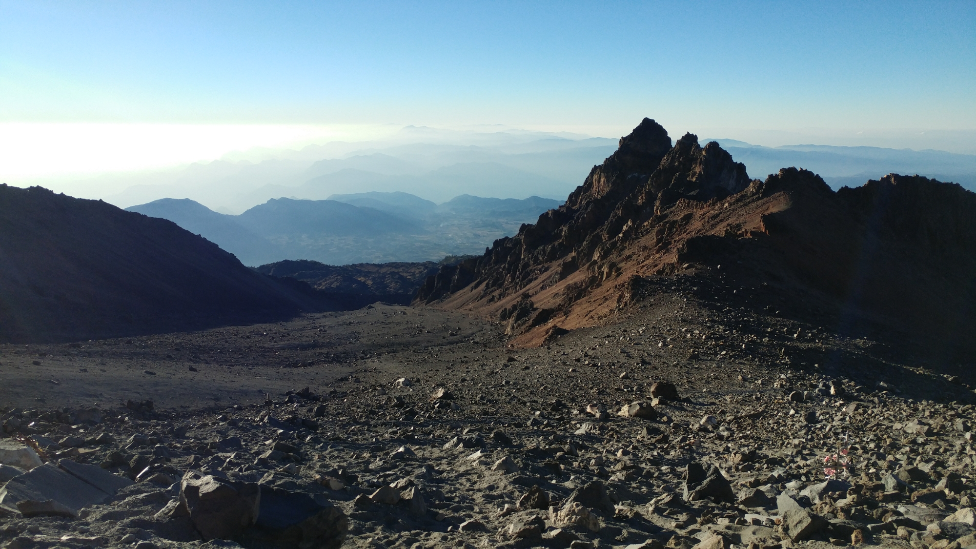 I got to the summit and no one was there. I’d expected to meet a mob of mountaineers who’d come up the north side but I was alone to take in the 360° view of Mexico. The weather was pleasant besides a cold wind that whistled through the mass of steel on the summit adorned with prayer flags, crucifixes, and other objects non-religious in nature. Behind, El Pico’s crumbling caldera yawned.