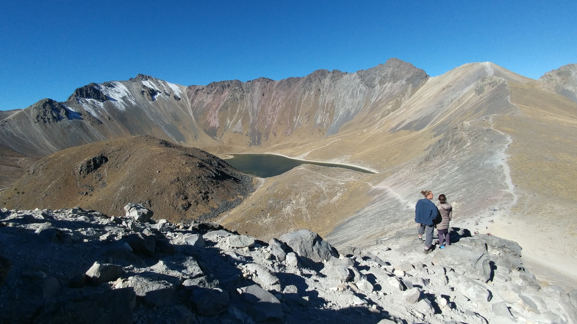 When the sun peeked over the crater, it was like a godsend. We finished off our haphazardly conceived, but delicious, camp granola, struck down our tents and headed up to see the lakes one last time. With the sun at our backs, the Sol and Luna lagunas displayed their respective hues, set in a landscape uniformly yellow with variations of orange, brown and red. Again the volcanoes of Mexico suggested the features of another planet.