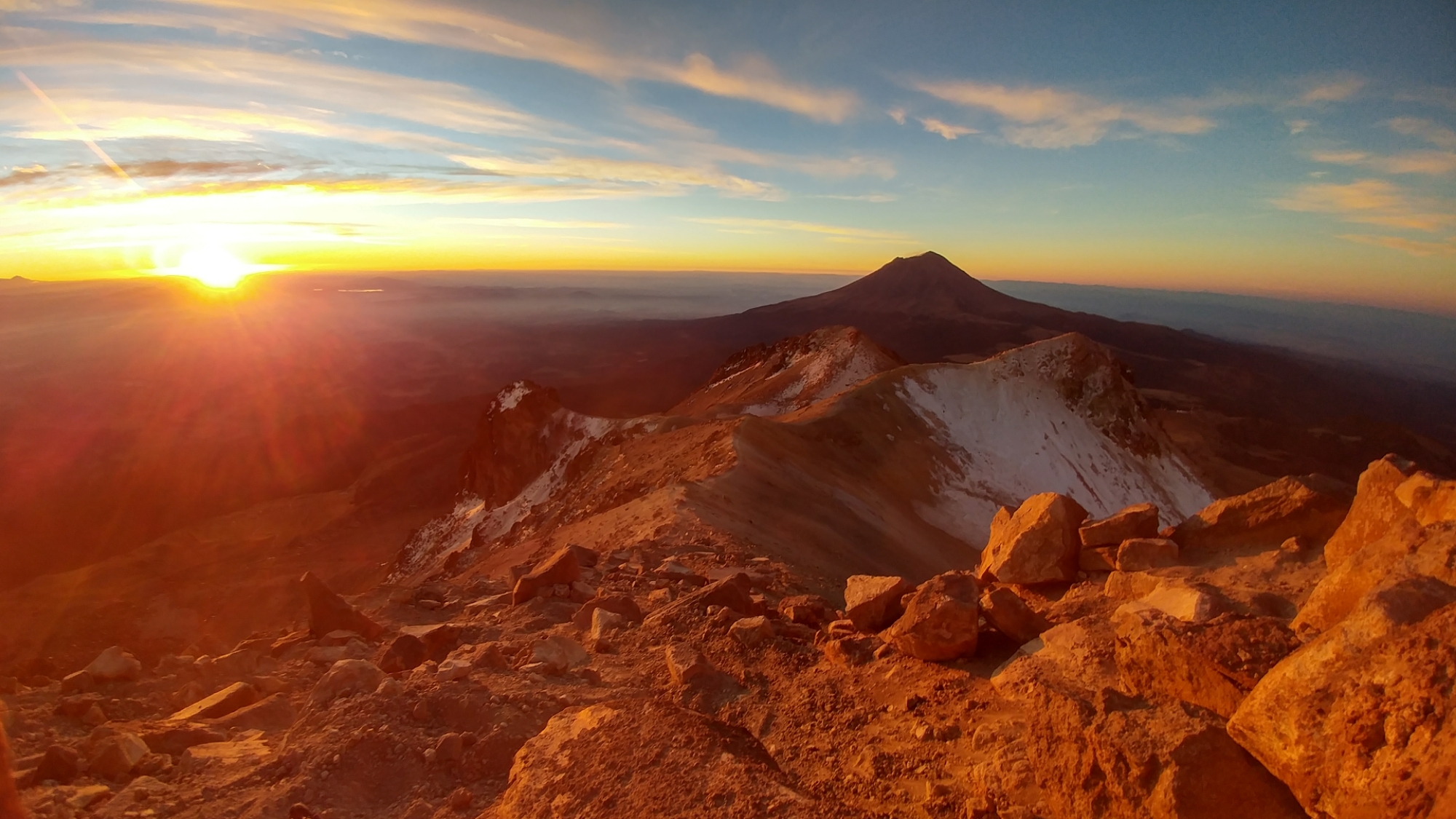 I felt way more sluggish than the previous day. Maybe it was the previous day’s ascent still in my legs, a lack of calories or a lack of sleep, but I was feeling it from the get-go. Hence I was a little late to catch the sunrise from the summit but still saw what I went up to see: epic alpenglow on Popo and Izta and the shadow of Malinche extending all the way to the horizon.