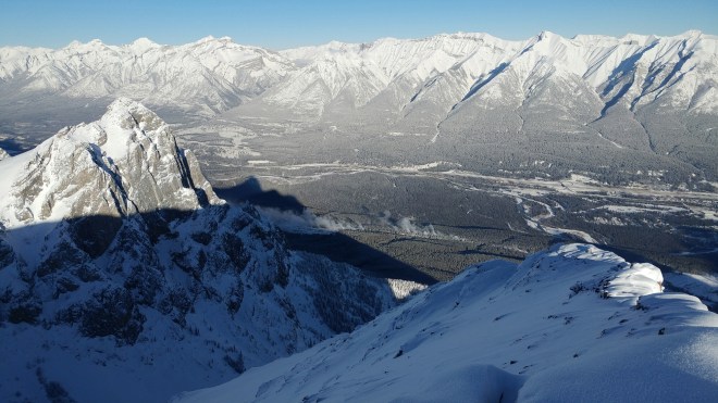 On December 10, I tagged Lookout Mountain in the Sunshine Village ski area. Starting at the parking lot at 7:38am, I reached the top of the Great Divide chair in just under two hours. The resort opened while I was still skinning straight up Lookout and a few people stopped to ask what I was doing or to cheer me on. An older gentleman referred to me as “the man” and “his hero” as I stashed my skis on my bag, ducked the ski area ropes and started marching up the remaining twenty metres to the true summit of Lookout. I stood around taking pictures for a few minutes before noticing a ski patroller bootpacking laboriously towards me: how quickly I went from being someone’s hero to being scolded and skiing down with my tail between my legs, haha… (2h23m/17km/1100m)