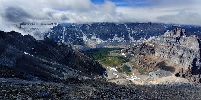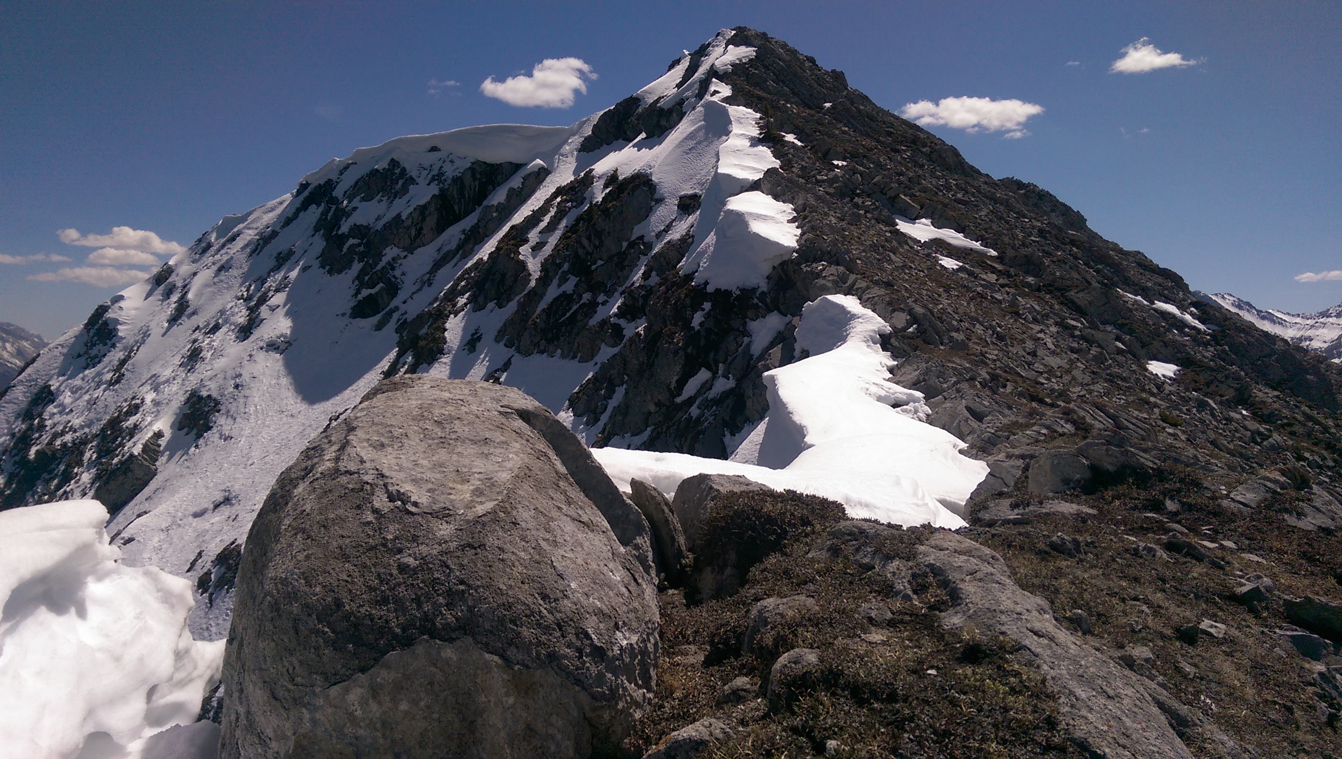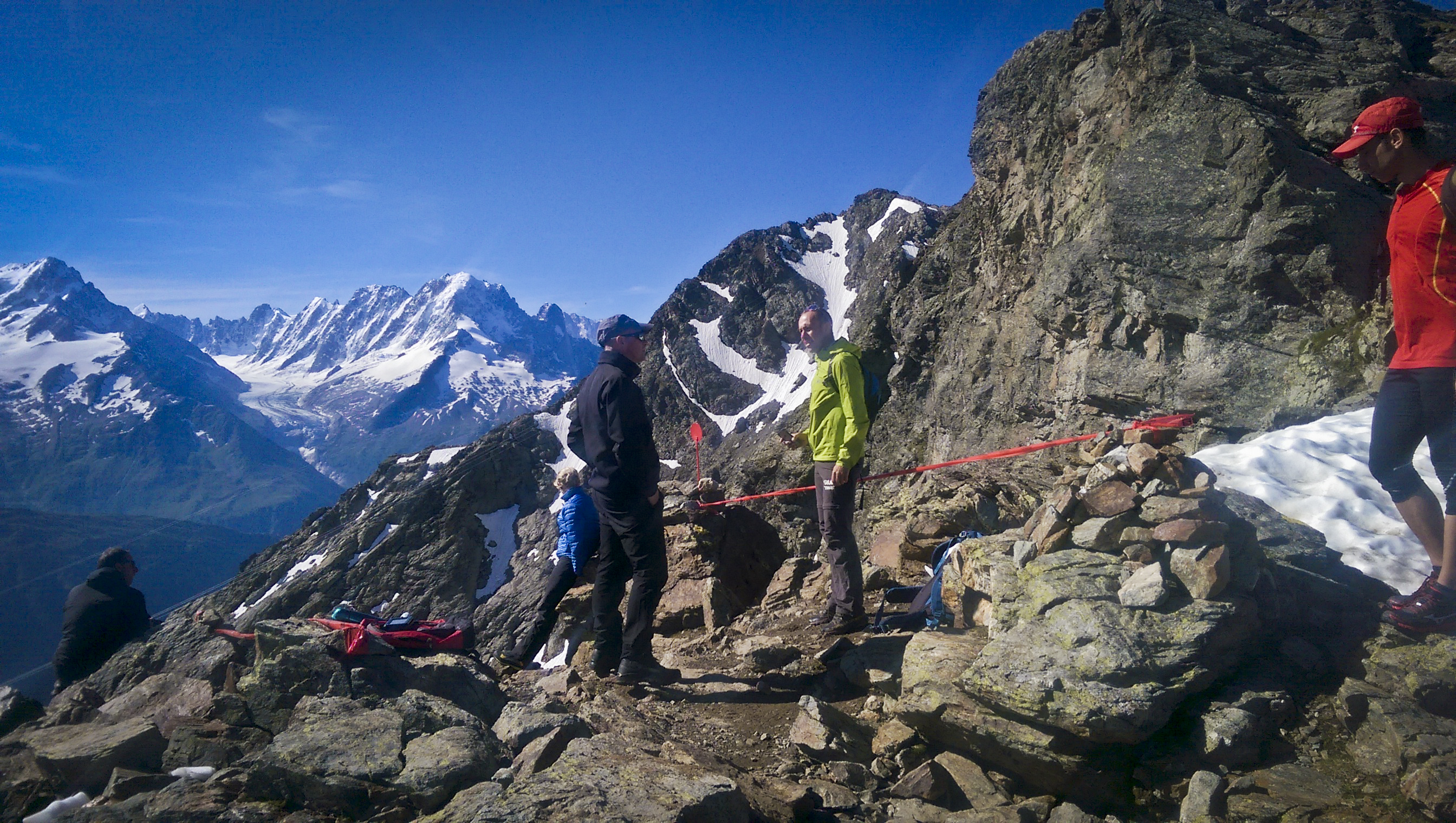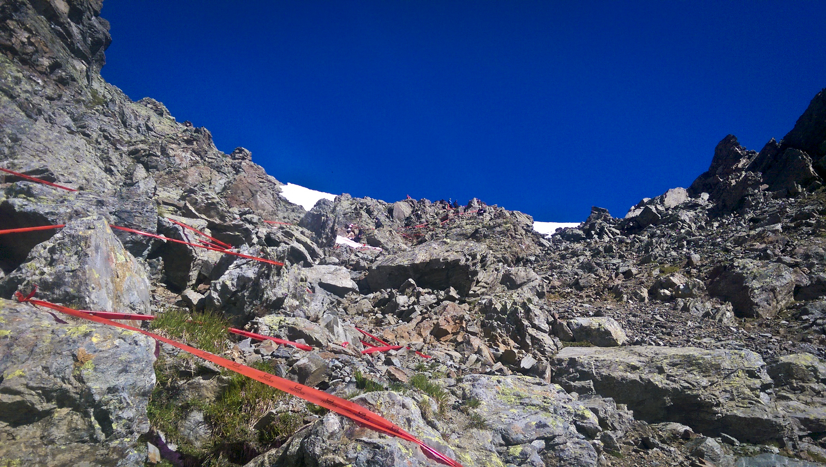 Our paces were slow to begin with but all became slightly slower once we hit a ramp of snow leading up to a notch in the col where immense steps had been chopped, making our task of climbing it much easier. The terrain at the top of the pass was practically scrambling and we relied on arms and handholds to support us through loose rock as wobbly legs couldn’t be trusted on this section alone. The safest route through the final scramble was very deliberately marked as a fall in this area could possibly mean breaking a bone or potentially worse.