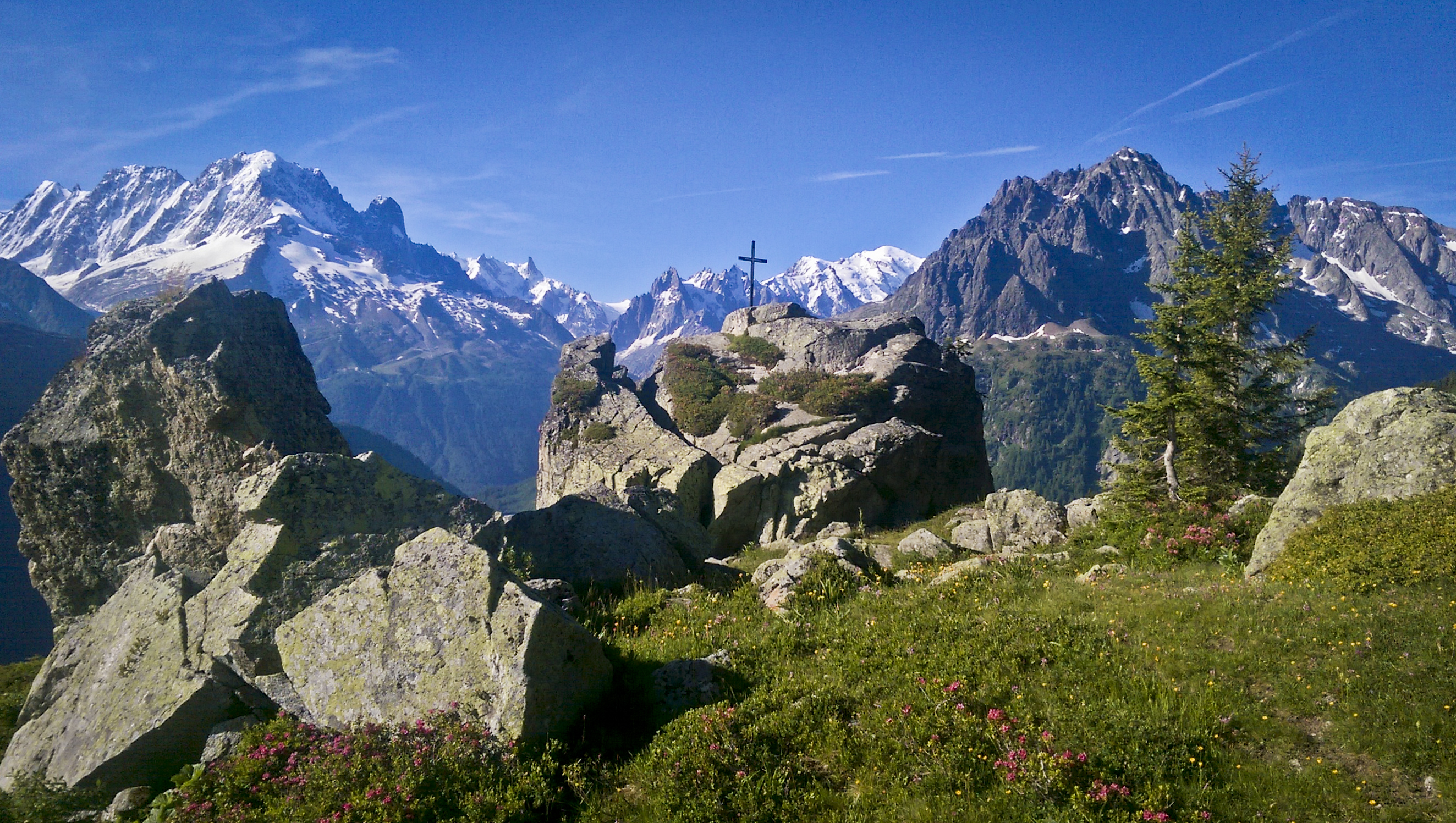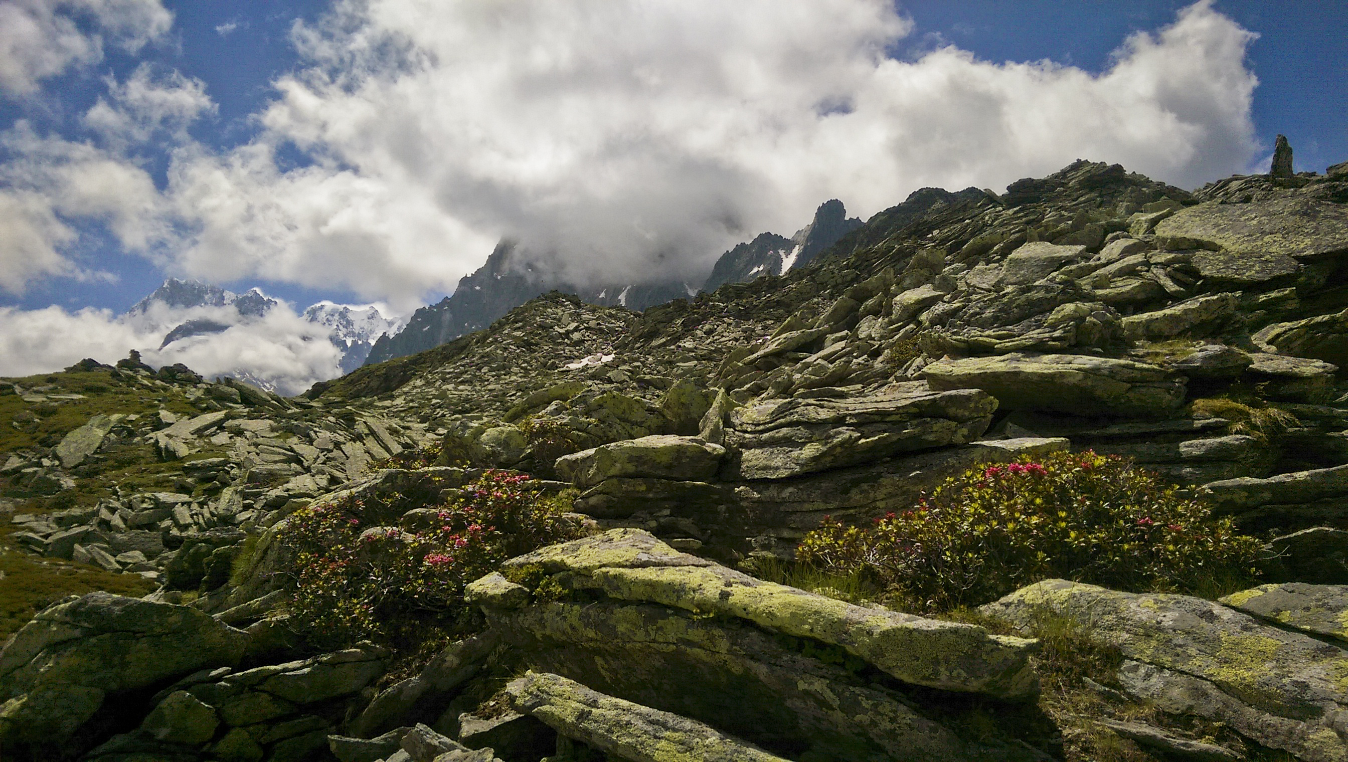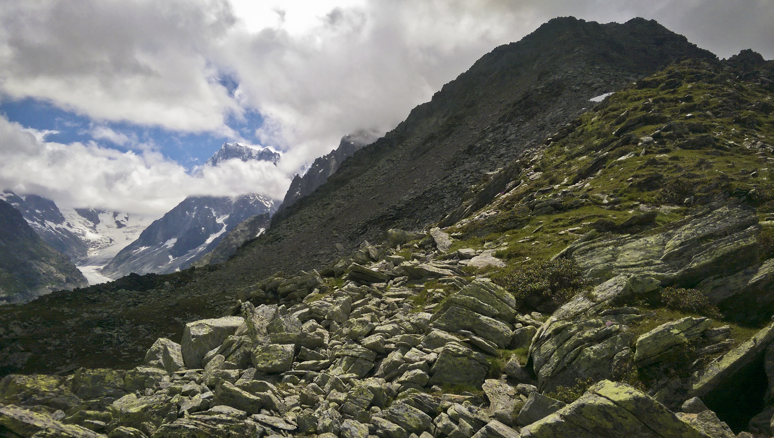 When we broke out of treeline, the scenery became incredible, with epic views of the Aiguille Verte and Mont Blanc looming behind us. The wide switchbacks started to narrow and snake up the scree of a giant bowl towards a rocky saddle high above us. Churning through scree in my sneakers, in the blistering heat of the sun — my specialty, I said.