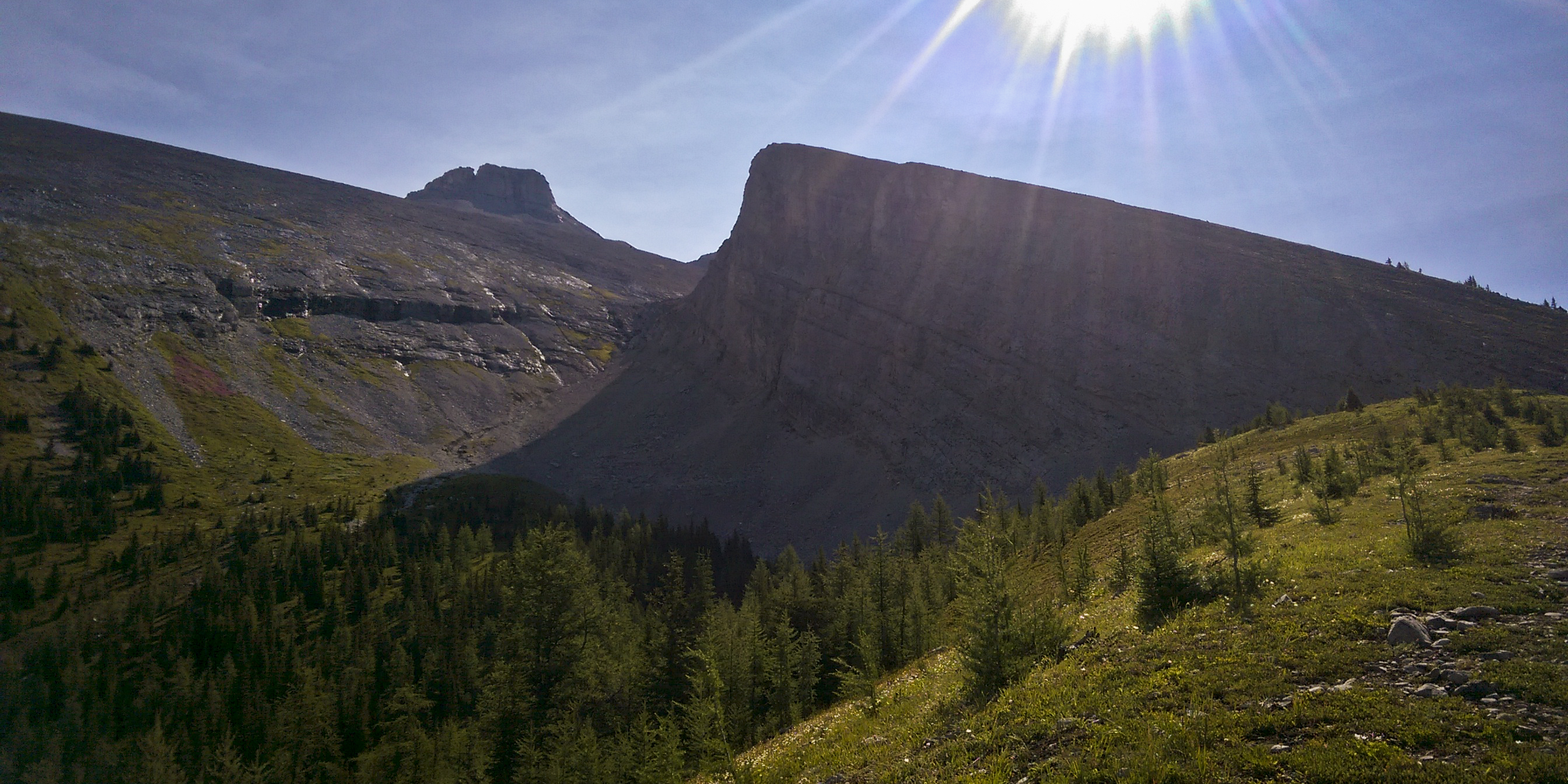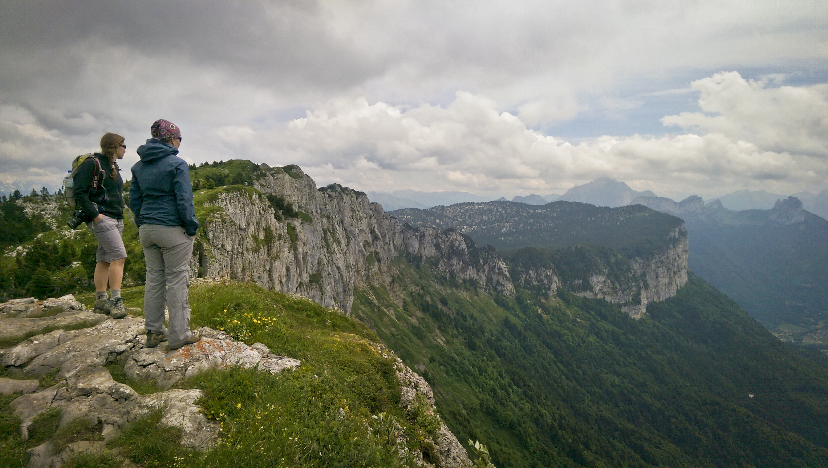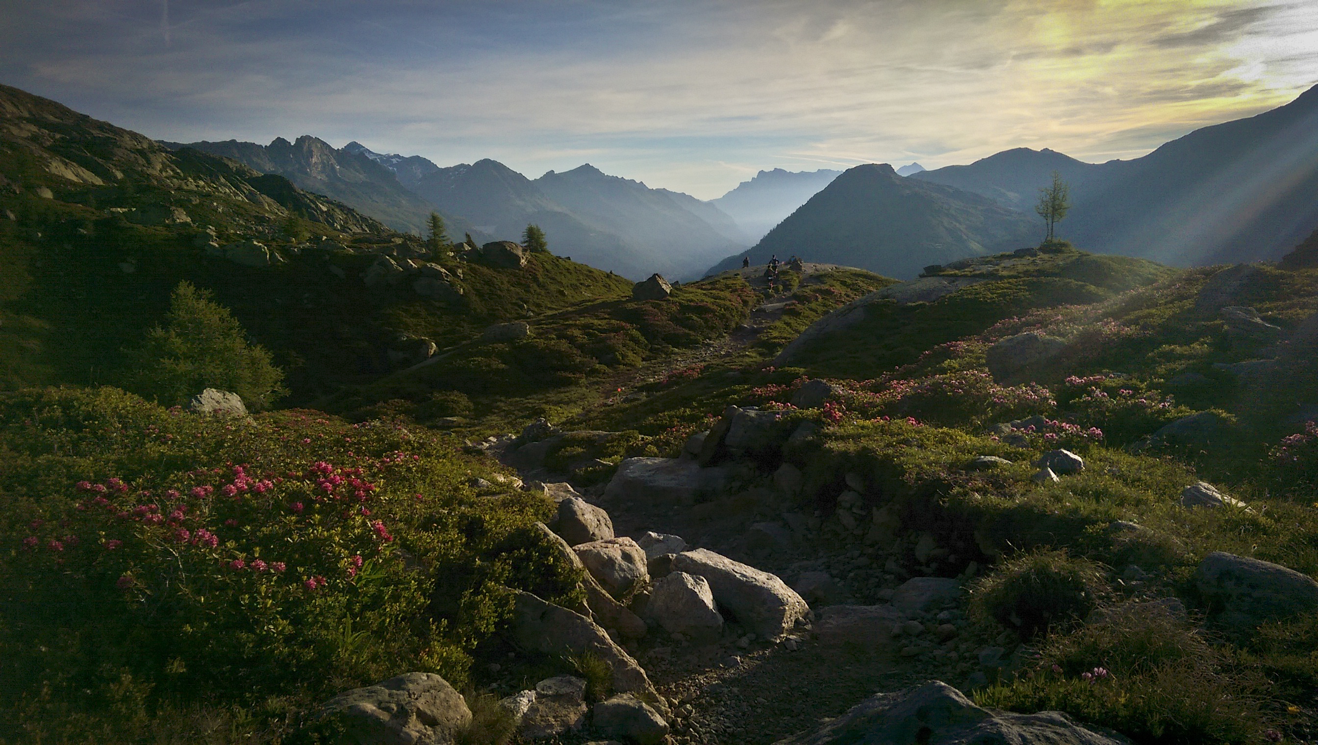 When we broke out of treeline, the scenery became incredible, with epic views of the Aiguille Verte and Mont Blanc looming behind us. The wide switchbacks started to narrow and snake up the scree of a giant bowl towards a rocky saddle high above us. Churning through scree in my sneakers, in the blistering heat of the sun — my specialty, I said.