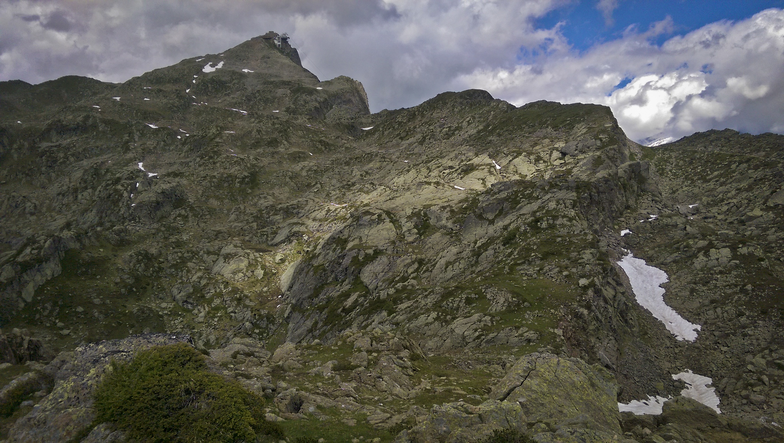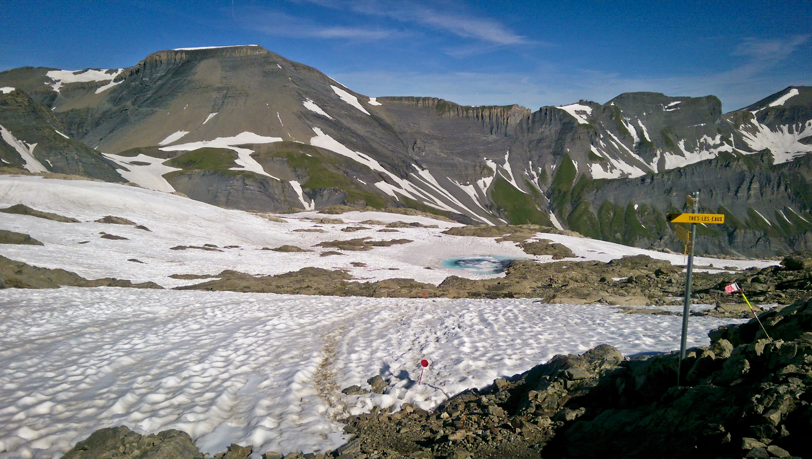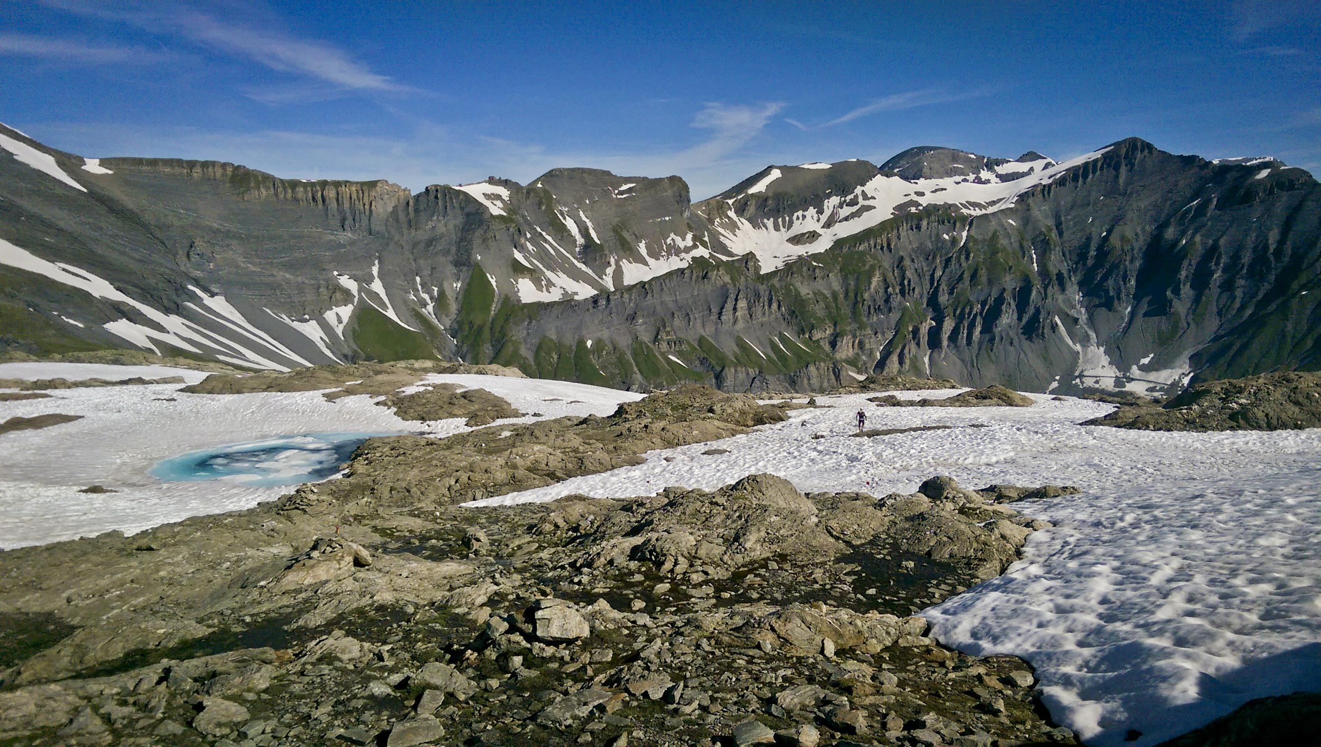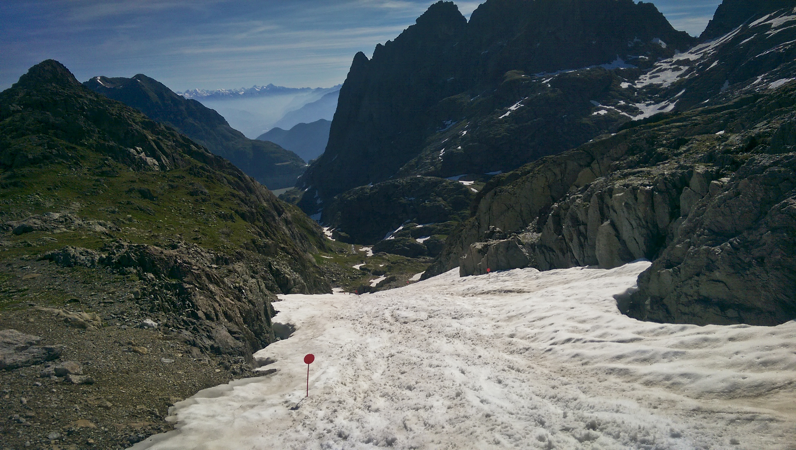 I reached the top of Col de la Terrasse at 9:20am, five and a half hours into the race, astounded by the technicality of the last section, more akin to a scramble in the Rockies than what a “marathon” suggests. Nevertheless, I was now standing astride the rim of vast snowy plateau punctuated by turquoise meltwater ponds and veined by ribs of rock. The idea of this being a “trail running” race had now been thrown out the window: first I had to climb a series of rocky ledges with my hands; now I was about to glissade down a snowfield, most likely not on my feet.