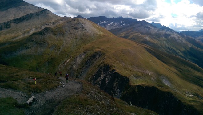 Once we reached the top of Tete de la Tronche, the procession opened up and we skirted across wide open ridges with the Italian Aosta Valley falling away to our lefts and a storm-shrouded Mont Blanc brooding to our rights. This is what UTMB was all about. This is why I wanted to run this race in the first place. This is why I came here, to run some motherfuckin’ singletrack on some motherfuckin’ ridge in the sky with some bigass motherfuckin’ mountains in the background.